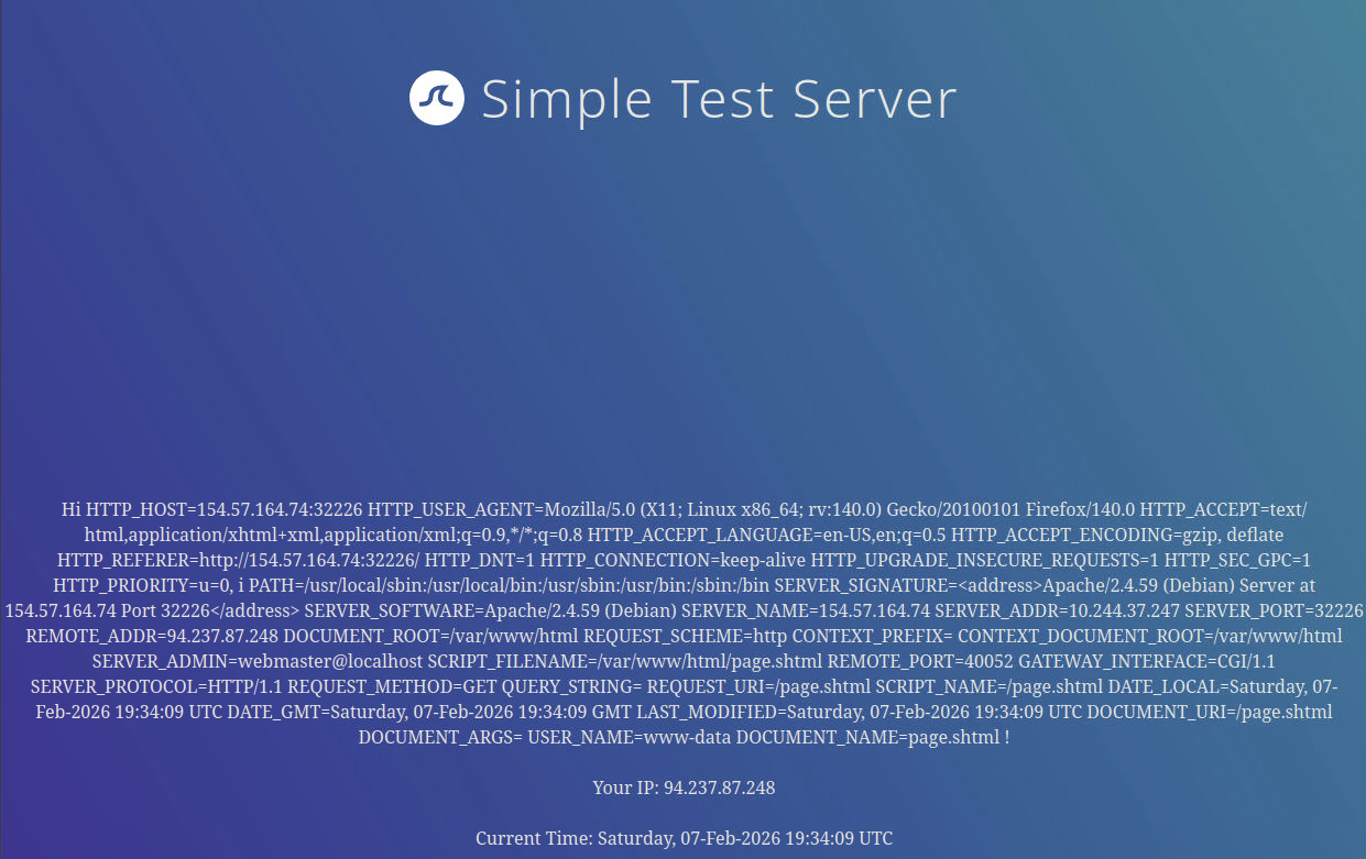 Si introducimos nuestro nombre, se nos redirige a /page.shtml, donde se muestra información general: