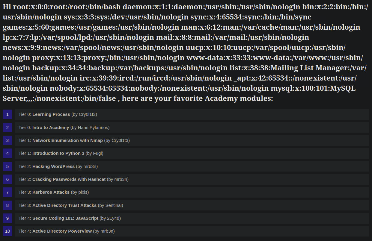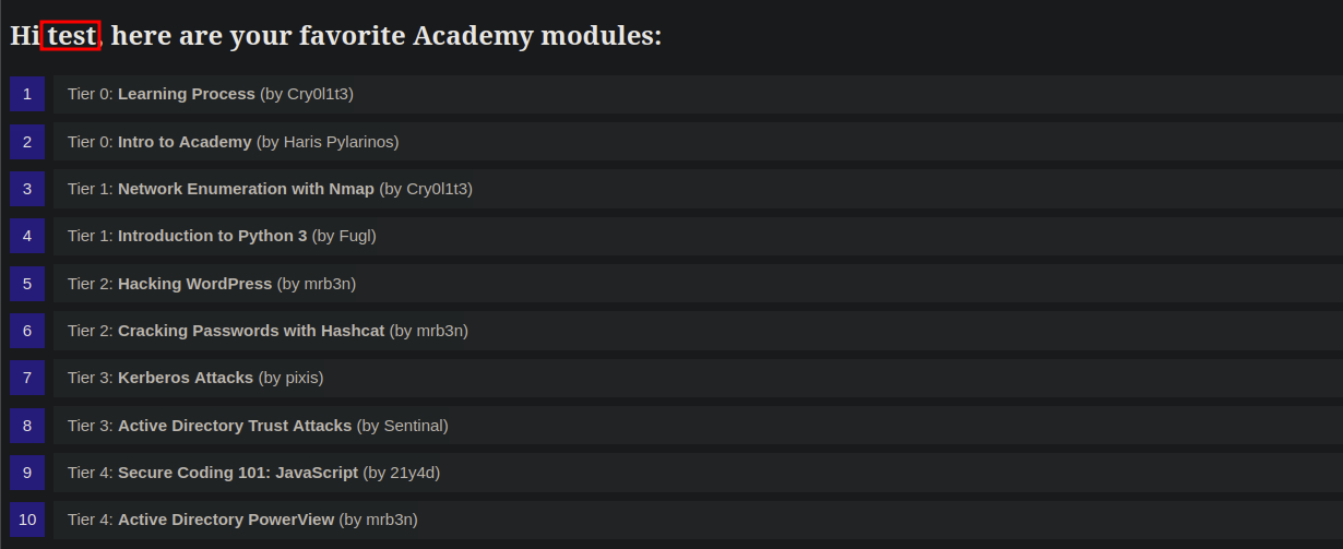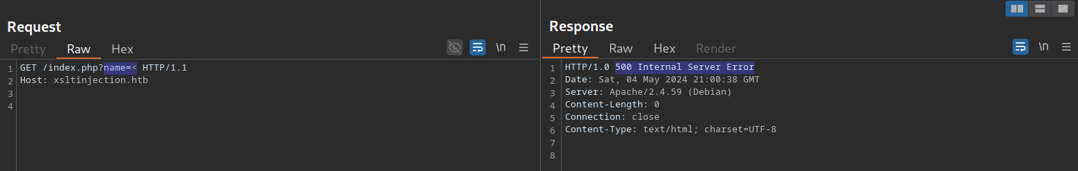 Como podemos ver, el nombre que proporcionamos se refleja en la página. Supongamos que la aplicación web almacena la información del módulo en un documento XML y muestra los datos mediante el procesamiento XSLT. En ese caso, podría ser vulnerable a la inyección XSLT si nuestro nombre se inserta sin desinfección antes del procesamiento XSLT. Para confirmarlo, intentemos inyectar una etiqueta XML dañada para provocar un error en la aplicación web. Podemos lograrlo proporcionando el nombre de usuario <: