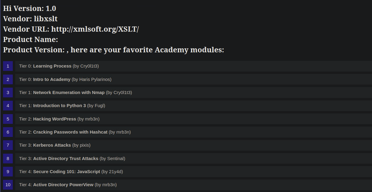 Dado que la aplicación web interpretó los elementos XSLT que proporcionamos, esto confirma una vulnerabilidad de inyección XSLT. Además, podemos deducir que la aplicación web parece basarse en la biblioteca libxslt y es compatible con la versión 1.0 de XSLT.