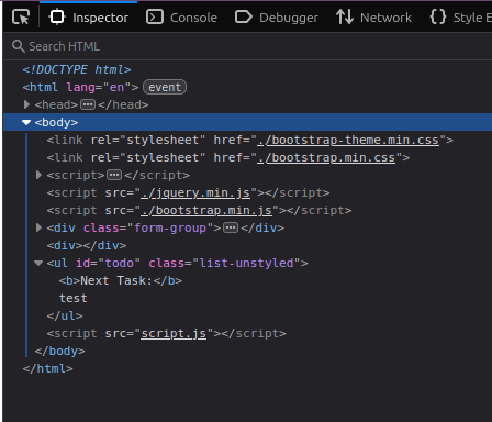 Por ejemplo en este caso vemos que la tarea que se añade a la list no es enviada al backend sino que se añade al DOM