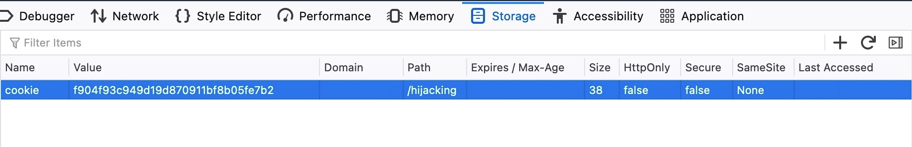 Por último, podemos utilizar esta cookie en la página login.php para acceder a la cuenta de la víctima. Para ello, una vez que navegamos al login, podemos pulsar Mayús+F9 en Firefox para mostrar la barra de almacenamiento en las herramientas de desarrollo. A continuación, podemos hacer clic en el botón + de la esquina superior derecha y añadir nuestra cookie, donde el nombre es la parte que precede al signo = y el valor es la parte que sigue al signo = de nuestra cookie robada.