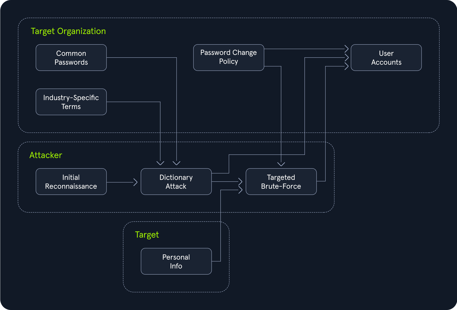Para ilustrar esto, consideremos a un atacante que tiene como objetivo una organización conocida por imponer cambios de contraseña regulares.
